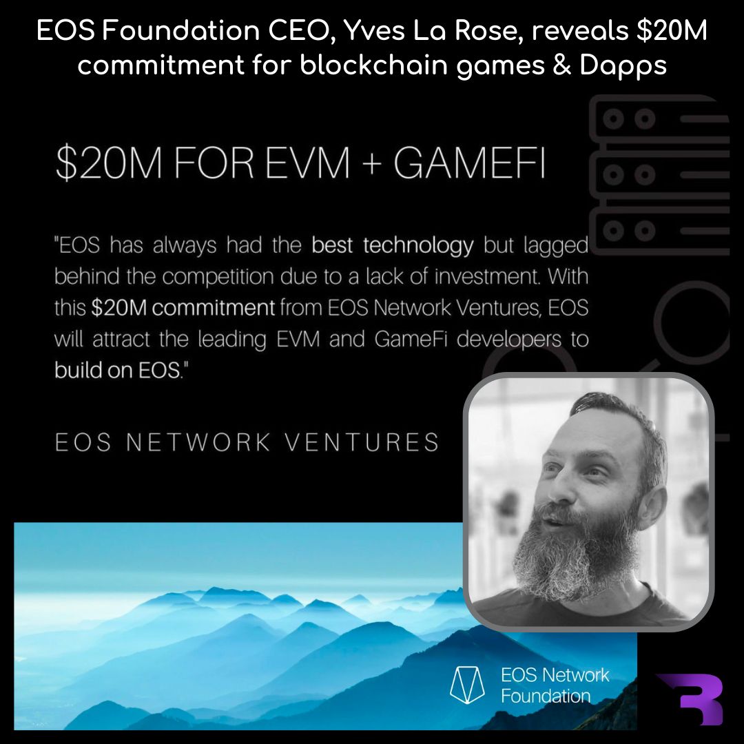 EOS Network Ventures (ENV) reveals a $20 million commitment for blockchain games and Dapps. The company is launching its EOS EVM on April 14th. EOS Foundation CEO is Yves La Rose. EVMs allow developers to build decentralized apps on other blockchains in the same way they would on the Ethereum network, leveraging the security protocols of the leading dApp ecosystem.